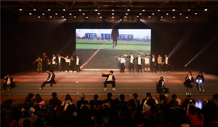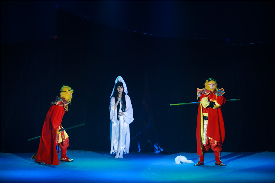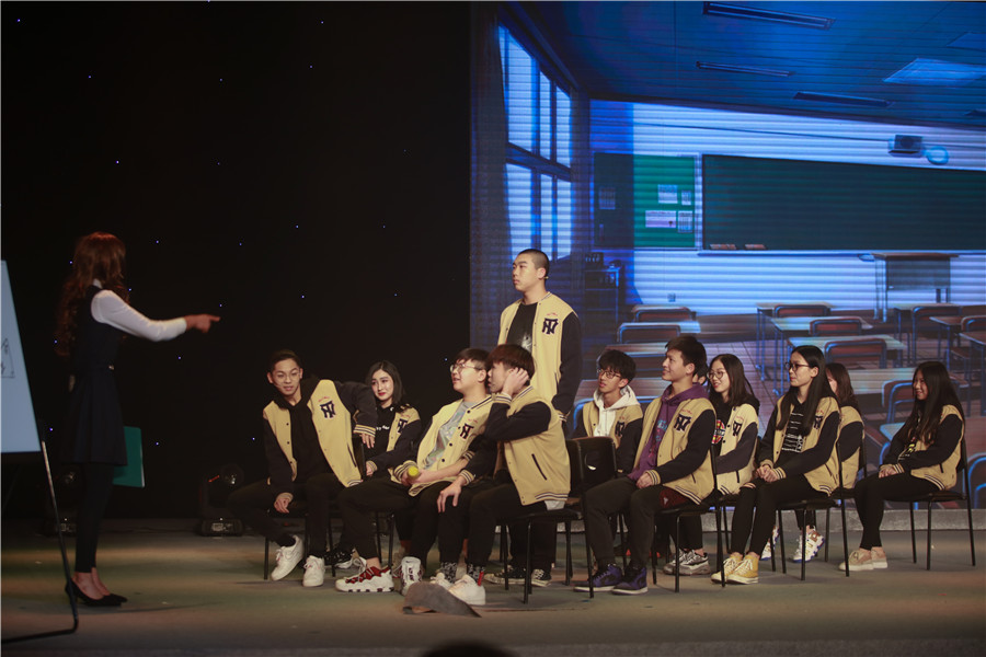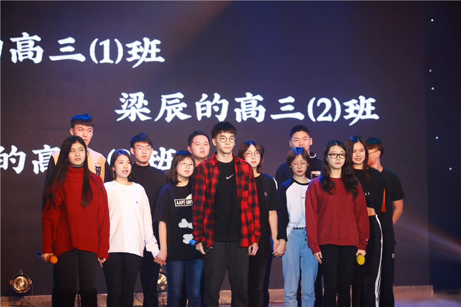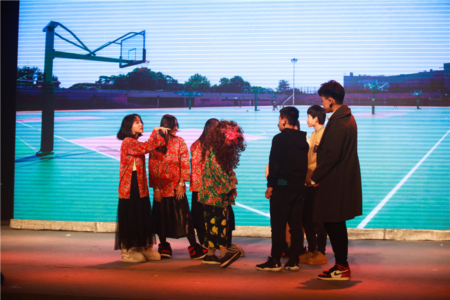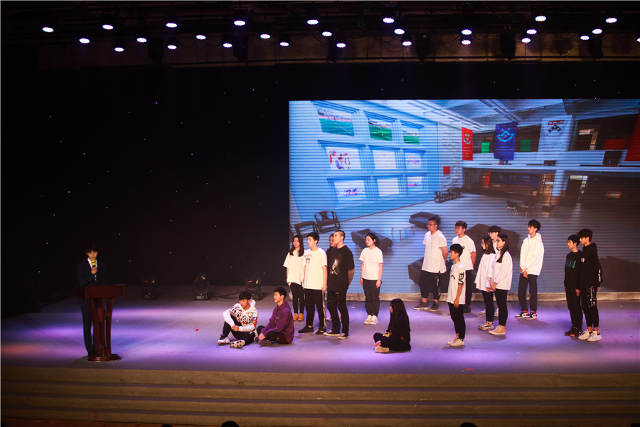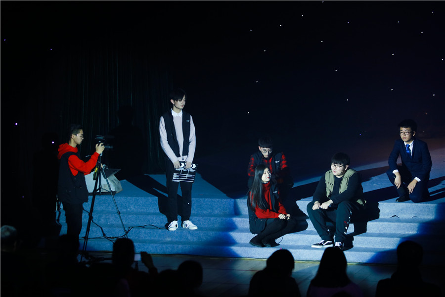 高二年级导演侯智越:我们高二展现的是《乐在社团中》,主要拍摄DI社团活动时的场景,重新创意了真假美猴王的桥段。