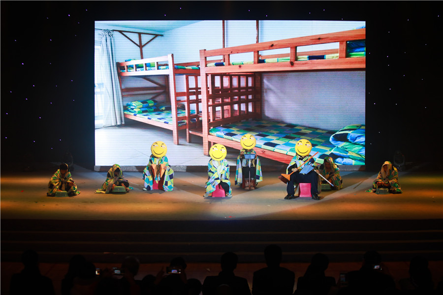 初一年级的《乐在生活区》,主角就是我们这位和蔼可亲的宿管老师。宿管老师的生日就要到了,同学们为了给老师一个惊喜,在宿舍熄灯之后,披着被子,拿着各种锅碗瓢盆、扫把、墩布当乐器,排练节目。