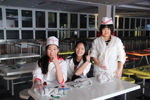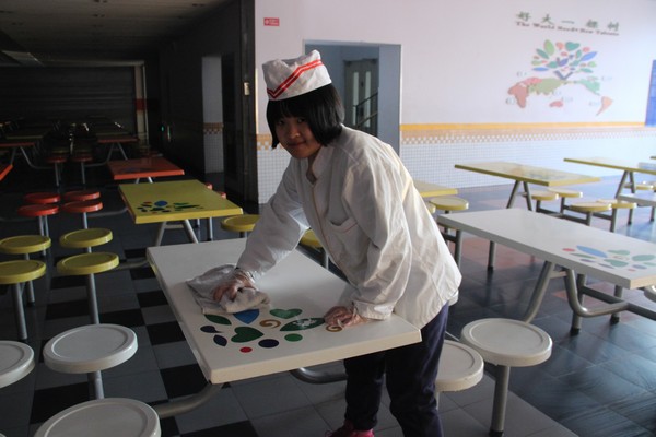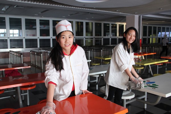 在学校食堂,男生女生拖地,洗碗,擦栏杆,干得有模有样,特别认真!
