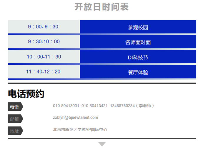 Email: principal@bjnewtalent.com(校长邮箱) luoyj@bjnewtalent.com(家长接待中心) hr@bjnewtalent.com(人力资源部)