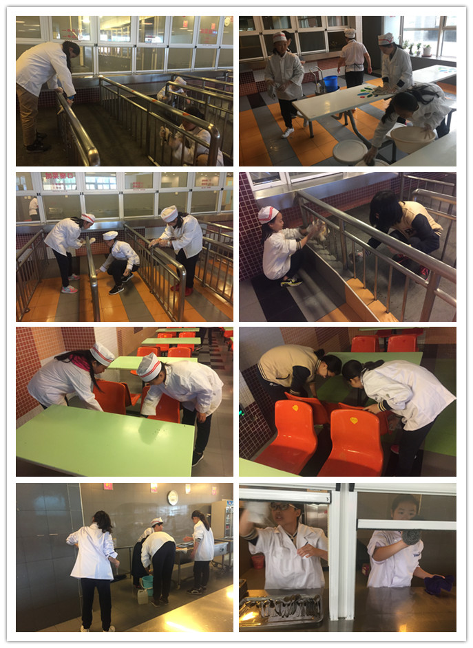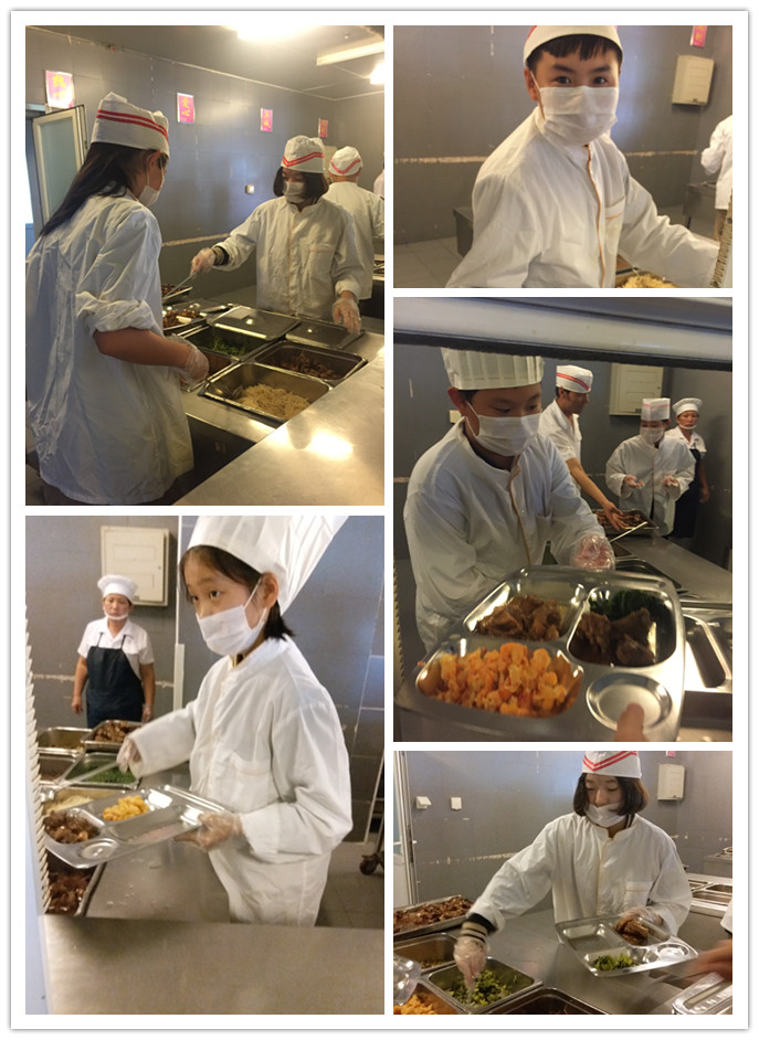 食堂的同学们也很快融入角色,帮助食堂阿姨,打扫卫生,清洁餐桌。到了中午同学们早早的穿戴好膳食处准备好的衣服,和帽子,走进餐厅,听食堂叔叔们讲解打饭的注意事项,下课铃声响后,有打饭任务的同学马上“上岗”,认真负责,工作起来俨然就成了一个标准的食堂工人。同学们通过这次活动收获很多,对于校警的工作也多了一份理解、多了一份尊重;在膳食科的孩子们更加会到了做饭阿姨与叔叔们的辛苦。一路成长,一路收获。