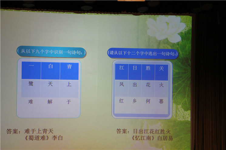 3.李白的潇洒豪放,杜甫的忧国忧民。九宫格设陷、三选一设卡,诗词赛的现场腹有诗书者,连连闯关.频频拿奖,热情踊跃、诗情满满。(诗词赛)