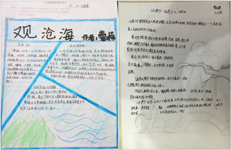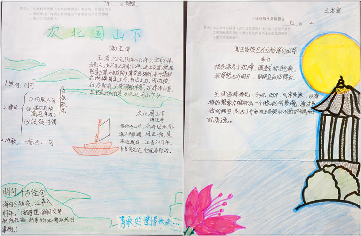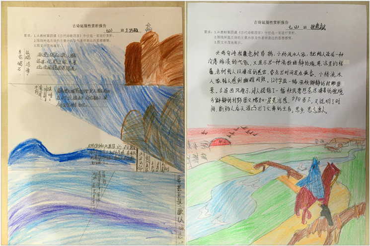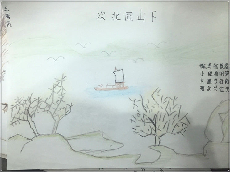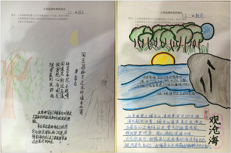 诗画人生,个性解读 《天净沙》里凄凉意境和游子哀思,《次北固山下》的壮美河山和故土情怀,《观沧海》中星辰变换和广阔胸襟,感悟于心,执笔于画,在孩子们手中呈现出丰富多彩的个性体验。