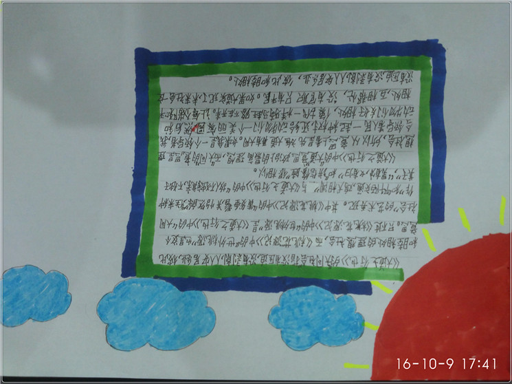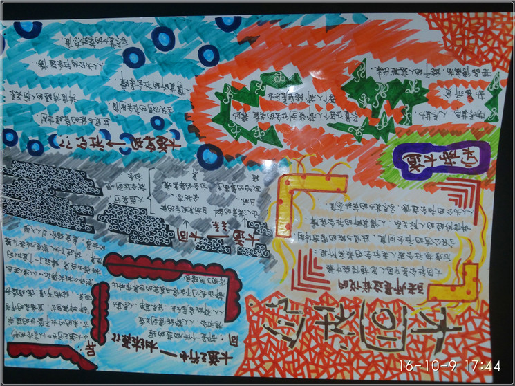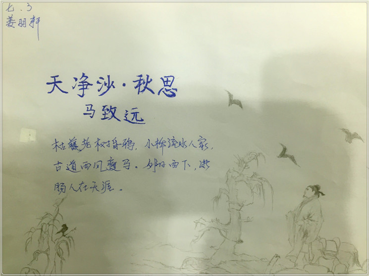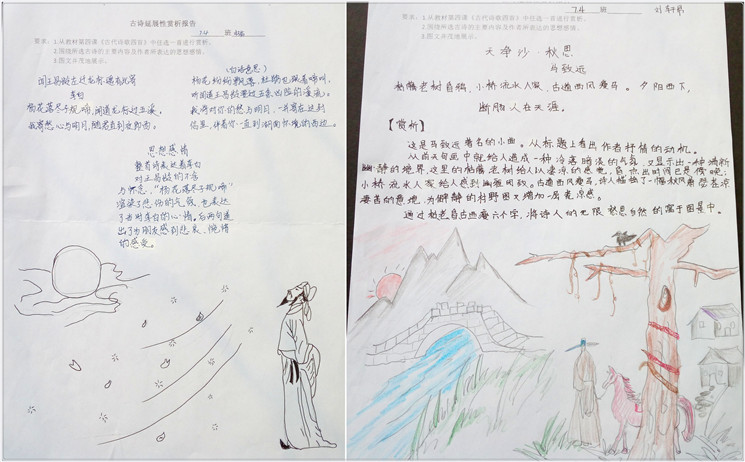 当我在完成这次作业时我在考虑,我要用颜色如何诠释作品!“枯藤老师昏鸦,小桥流水人家”我不涂色彩,就用黑白来诠释。看着古诗句“古道西风瘦马,夕阳西下,断肠人在天涯”我感觉自己的内心和作者有了深深的共鸣,天涯游子,思乡之浓,我用什么颜色,什么画面更好的表达出作者的思乡画面呢!古诗延展性报告,我感觉自己成了诗作的本人,理解的更加透彻,更加走进了作者。